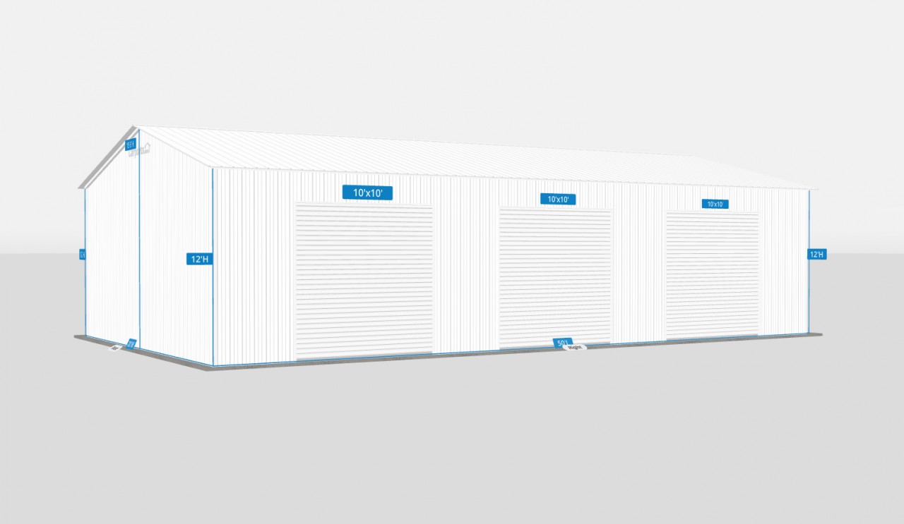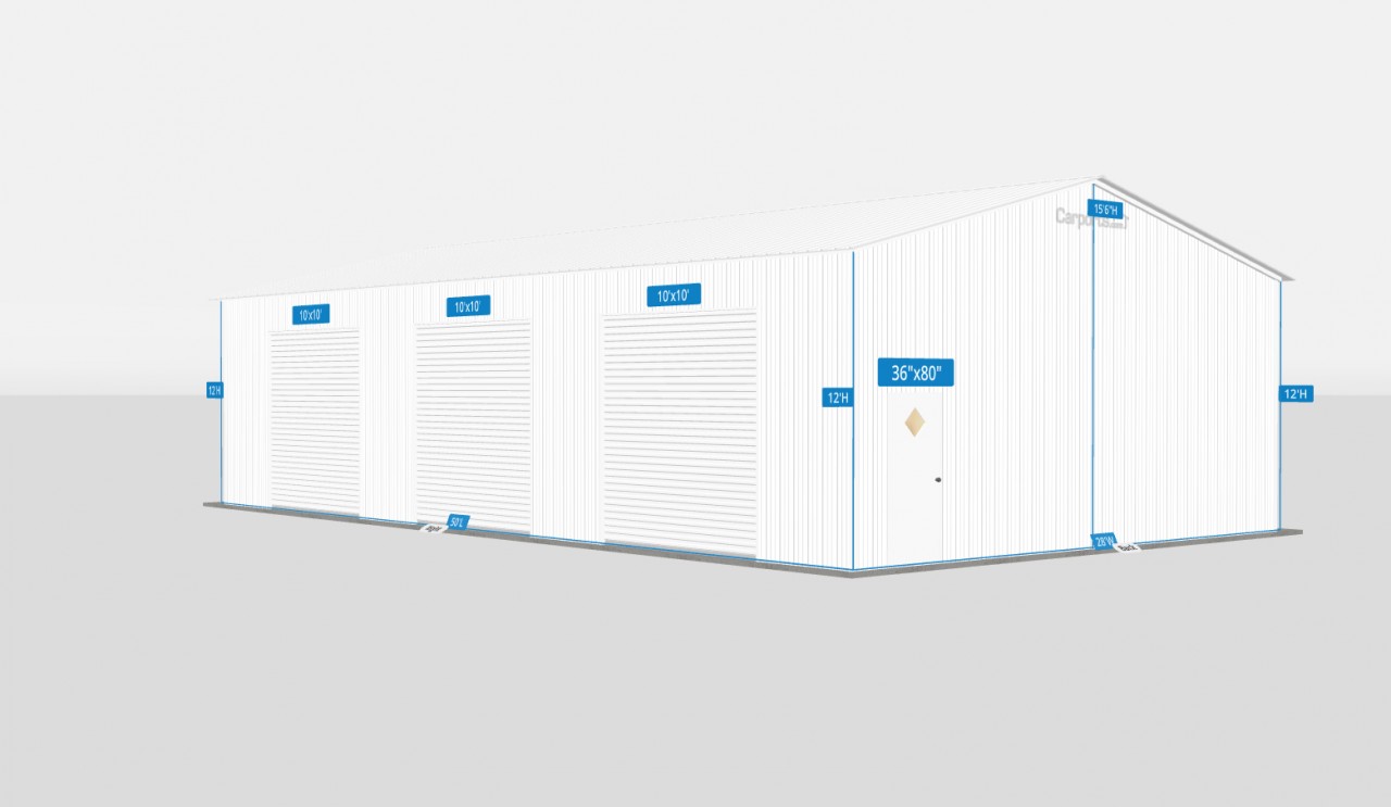 Maximize space and accessibility with this 28x50x12 three-door side-entry garage. Designed for convenience and durability, it features easy drive-up access, strong steel construction, and full enclosure to protect vehicles, tools, or equipment—making it a versatile solution for storage, work, or everyday use.
